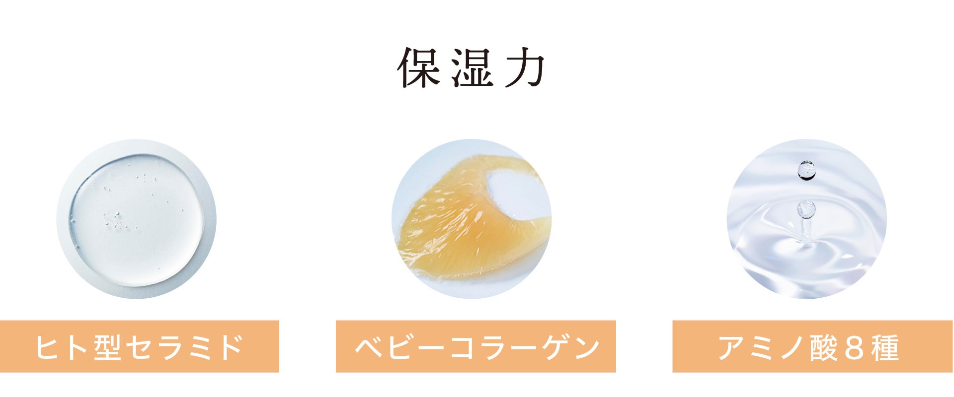 赤ちゃんの肌と同じ潤いと弾力があり、キメを整え高い保湿力で肌の内側からふっくらさせます。