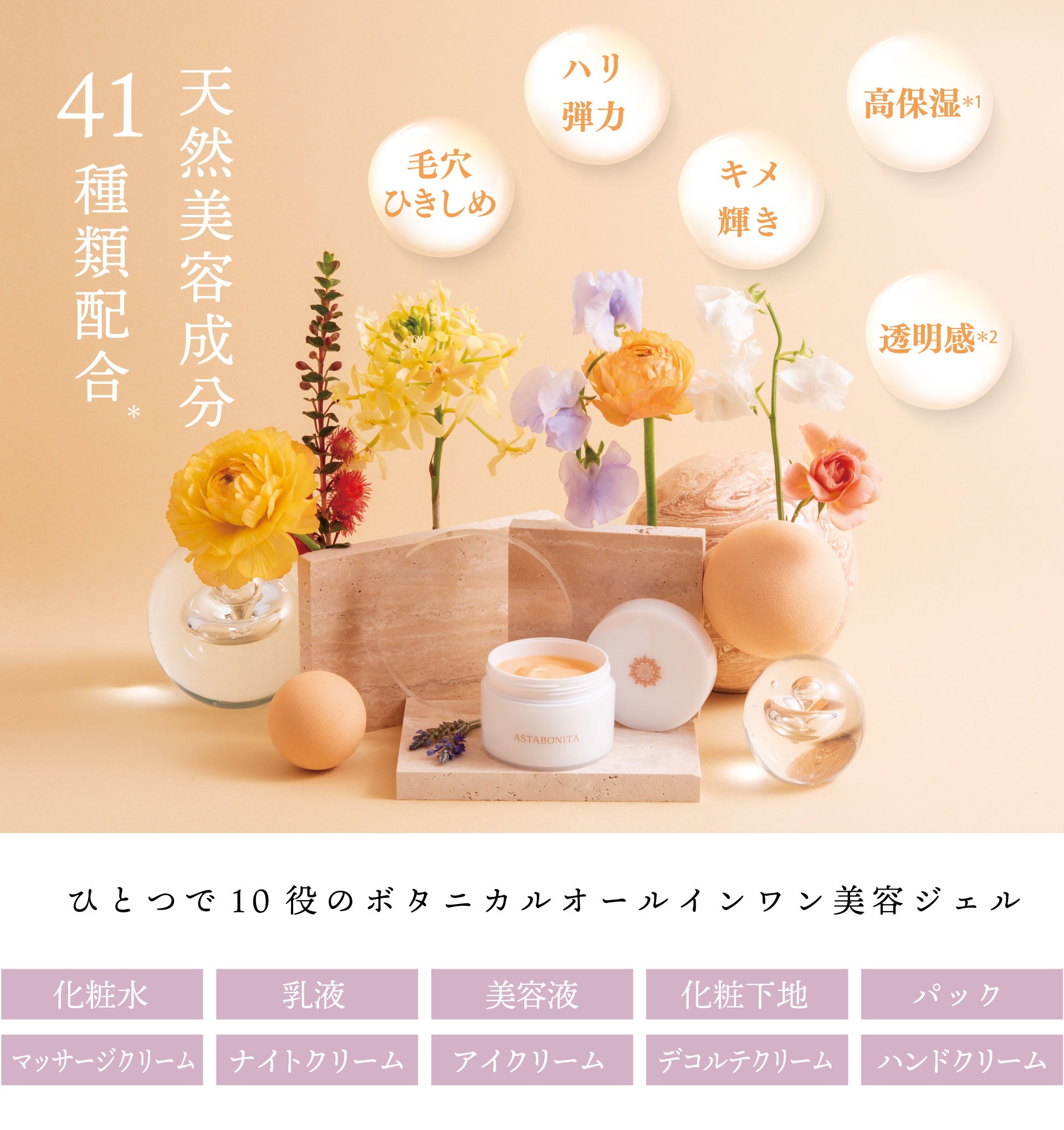 成分に含まれる抗酸化力の高いアスタキサンチンから「asta」と、スペイン語で美しいという意味の「bonita」を組み合わせた、99.25%天然成分の美容ジェル。